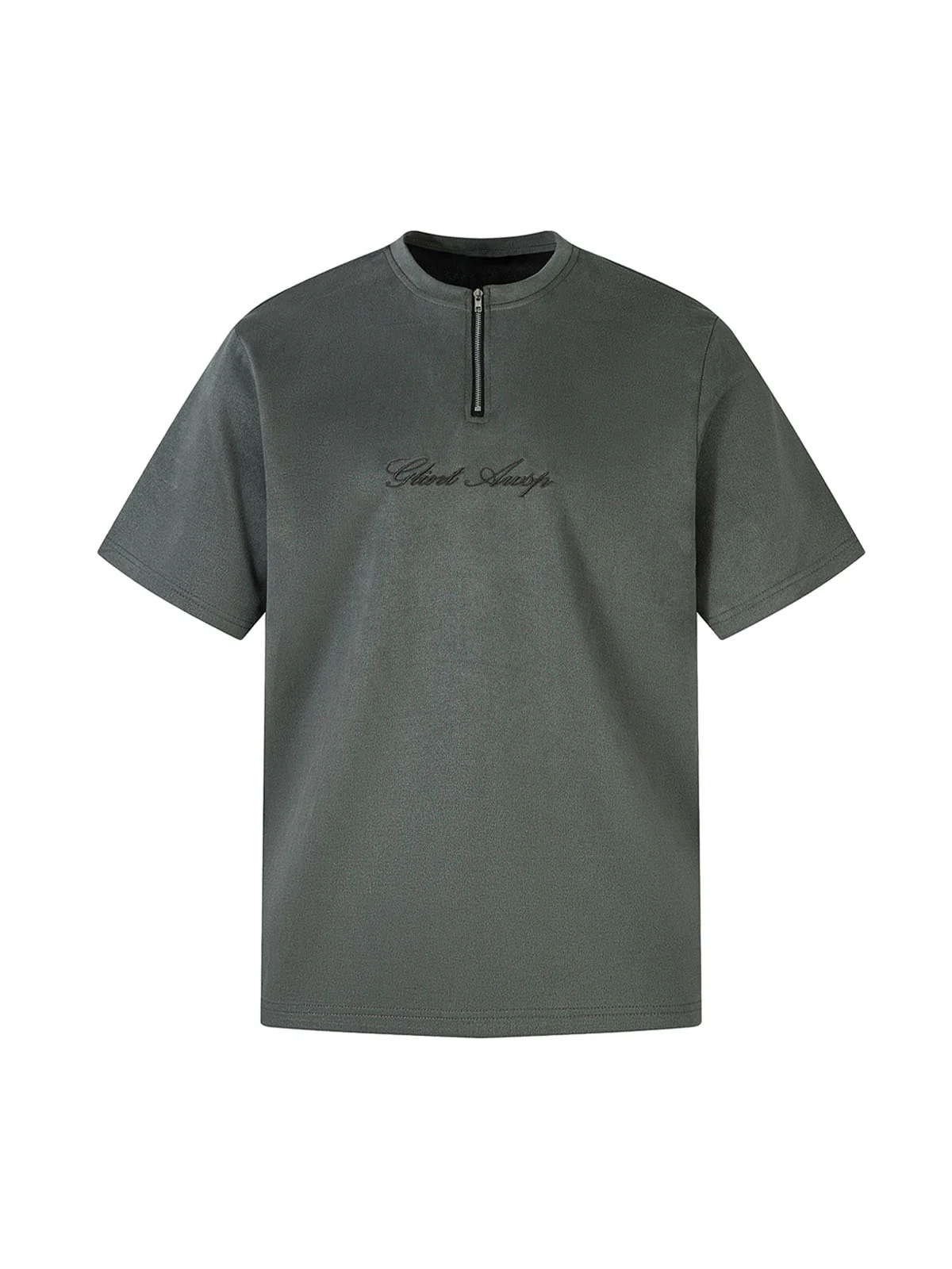 Retro Quarter Zip Up Suede Embroidered T-shirt