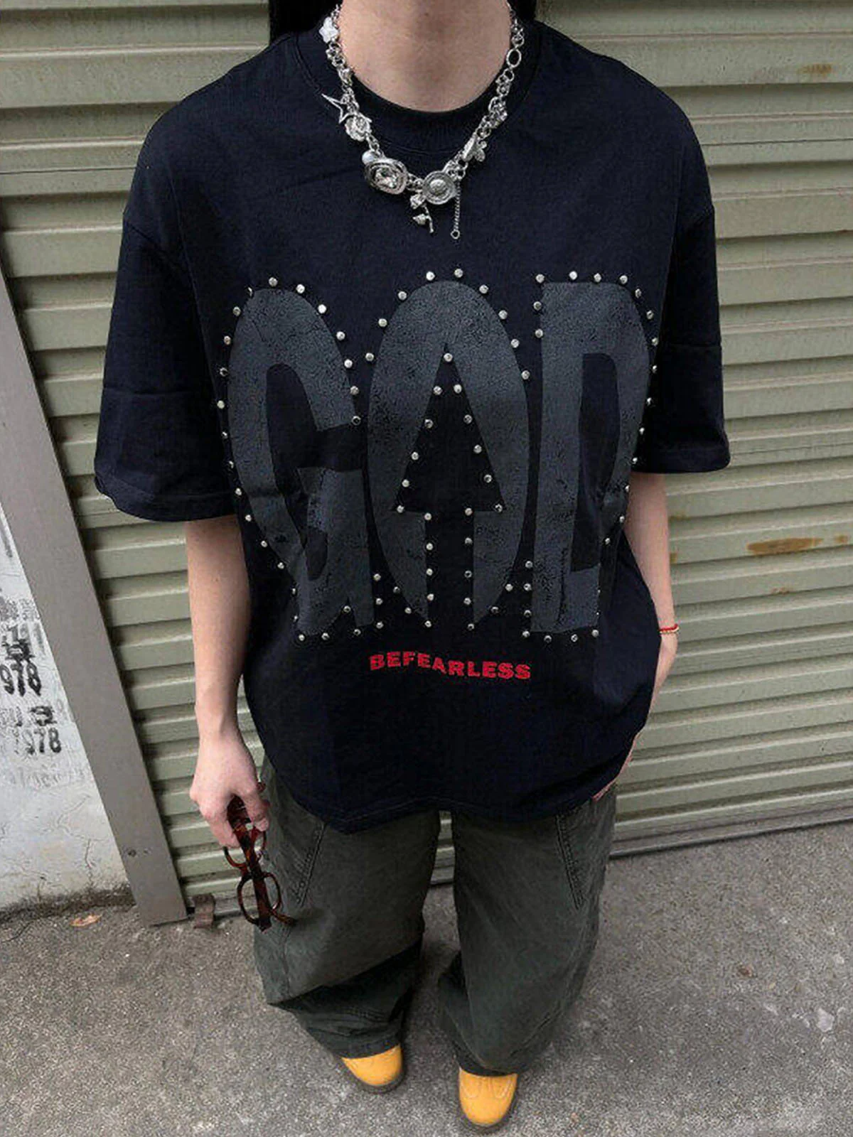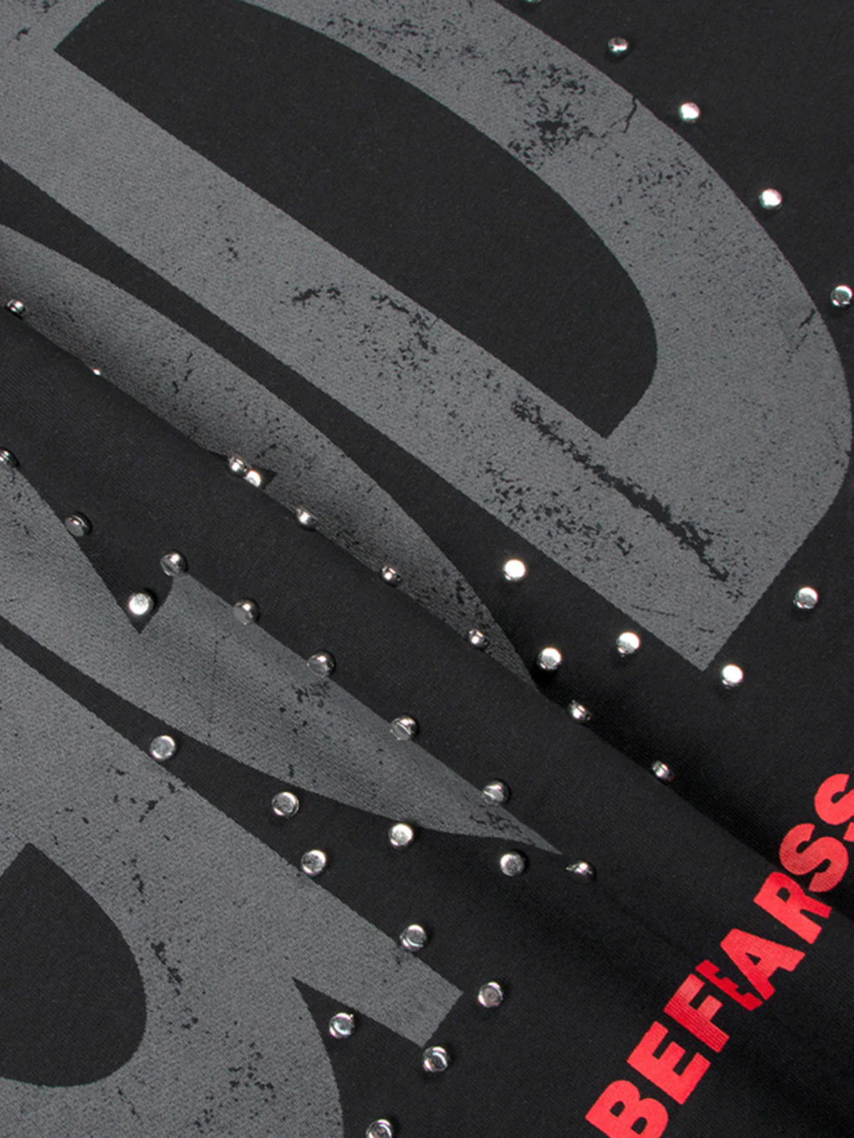 • Design Elements: Large graphic print with rivet embellishments, bold slogan text